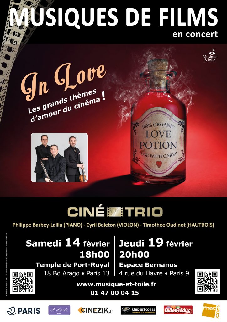 Image suivante Affiche Concert In Love Les plus grands thèmes d’amour du cinéma -Ciné-Trio 14 et 19 février 2026 Les plus beaux thèmes d’amour du cinéma en concert avec le Ciné-Trio , piano violon hautbois.
